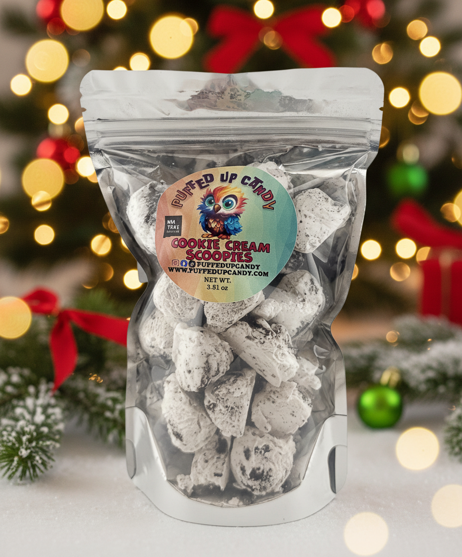 Freeze-dried Cookies and Cream Scoopies is a freeze-dried version of cookies and cream ice cream. In this form, the moisture is removed, resulting in a light, crunchy texture while preserving the familiar flavors of creamy vanilla and chocolate cookie pieces. The freeze-drying process maintains the scoop shape and intensifies the taste, providing a crunchy bite that softens as it melts in your mouth. This treat is great as a shelf-stable, portable snack for travel, hiking, or any time you want a unique twist on a classic dessert.