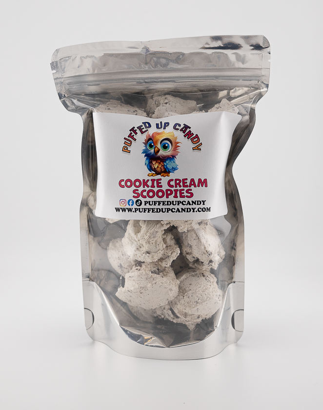 Freeze-dried Cookies and Cream Scoopies is a freeze-dried version of cookies and cream ice cream. In this form, the moisture is removed, resulting in a light, crunchy texture while preserving the familiar flavors of creamy vanilla and chocolate cookie pieces. The freeze-drying process maintains the scoop shape and intensifies the taste, providing a crunchy bite that softens as it melts in your mouth. This treat is great as a shelf-stable, portable snack for travel, hiking, or any time you want a unique twist on a classic dessert.